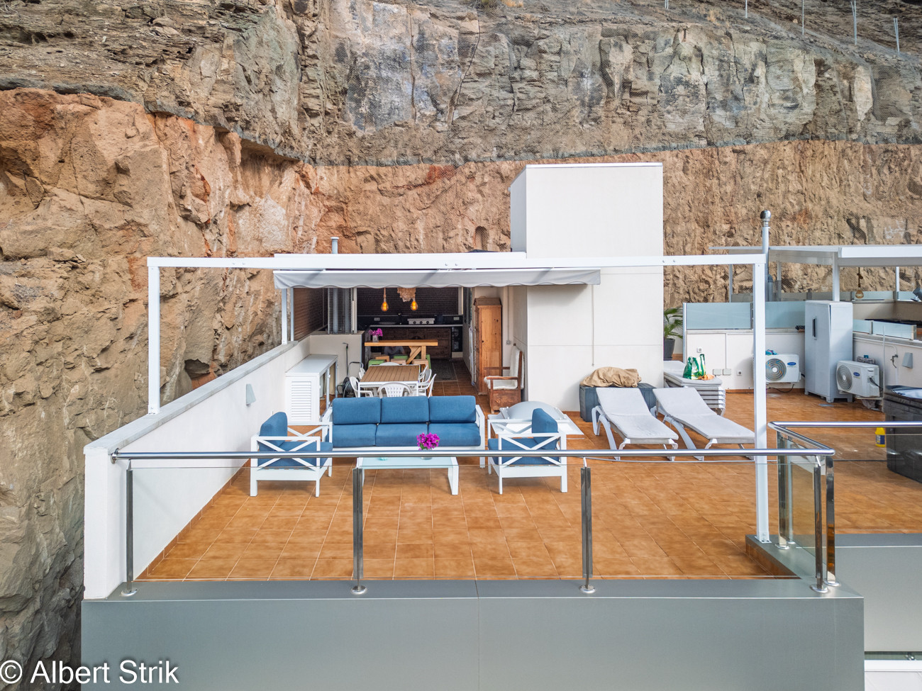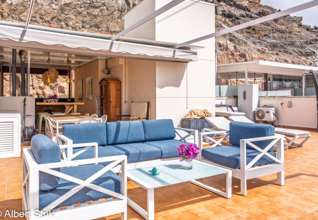 Terraza frente al salón de 60 m2 con impresionantes vistas a Mogan y al mar.